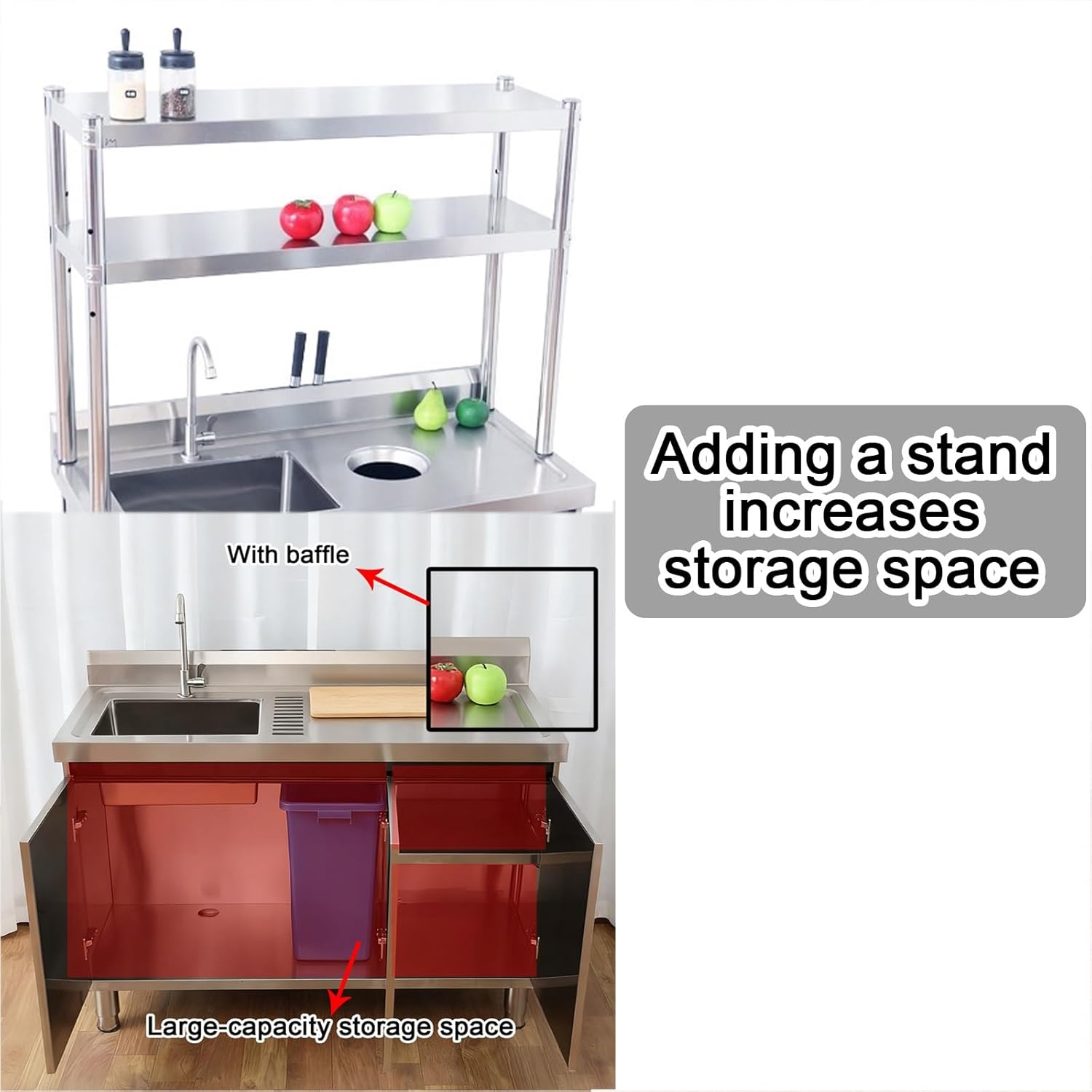 Name: WorkbenchMaterial: Stainless SteelColor: SilverContents Include: Workbench x1(Other items not included)Dimensions:80x50x80cm (31.5x19.7x31.5")80x60x80cm (31.5x23.6x31.5")100x50x80cm (39.4x19.7x31.5") 100x60x80cm (39.4x23.6x31.5")Features:1. Adjustable leg height accommodates uneven floors; rear water inlet for enhanced aesthetics2. Double-door design reveals spacious interior storage for diverse items3. Countertop features rounded corners to prevently water splashing; adjustable legs adapt to floor height for uneven surfaces; rear water inlet ensures visual appealVersatile Applications: for kitchens, restaurants, bubble tea shops, fruit stores, bakeries, hotels, balconies, living rooms, supermarkets. Features a convenient sink with a port.Important Notes:1. Dimensions are measured manually and may vary slightly. Colors may appear different due to shooting angles or lighting conditions.2. Stainless steel surfaces may exhibit minor scratches, which do not affect functionality.