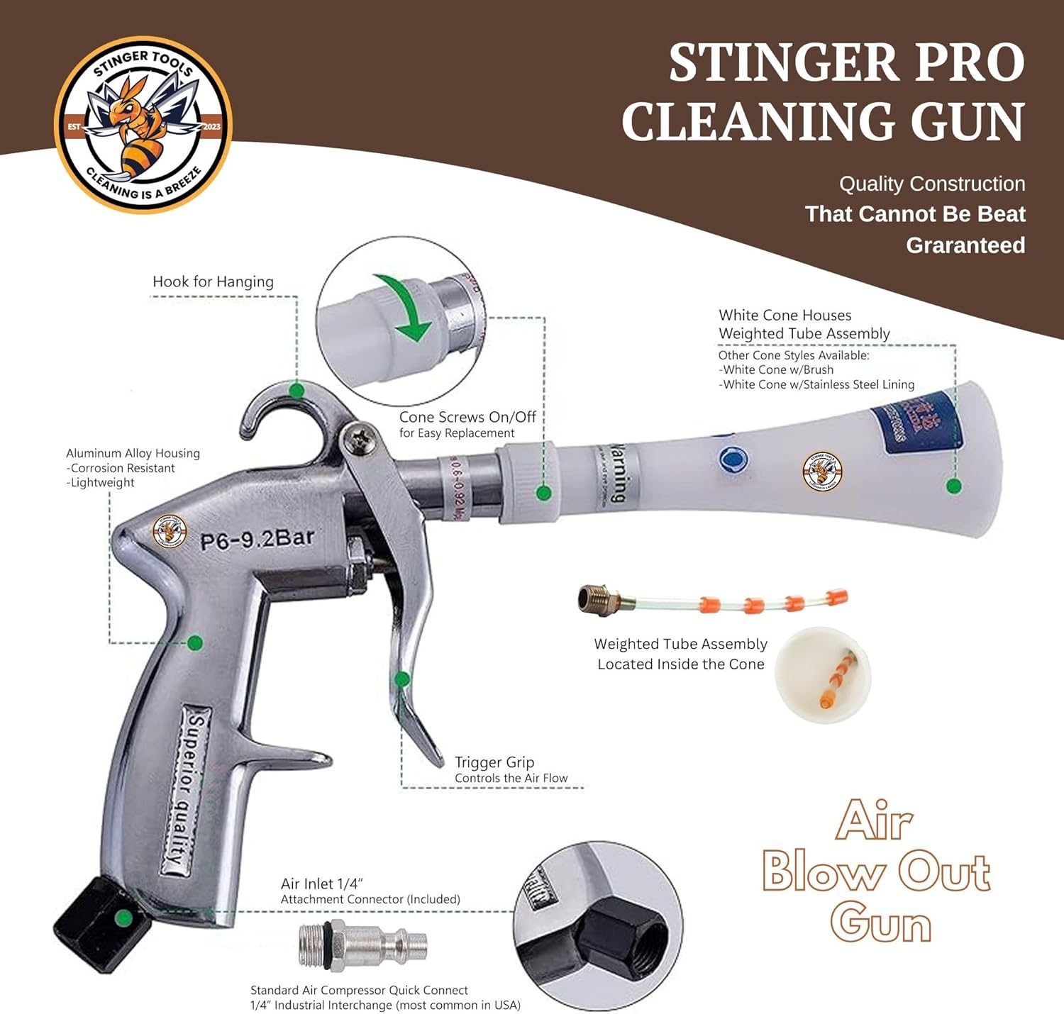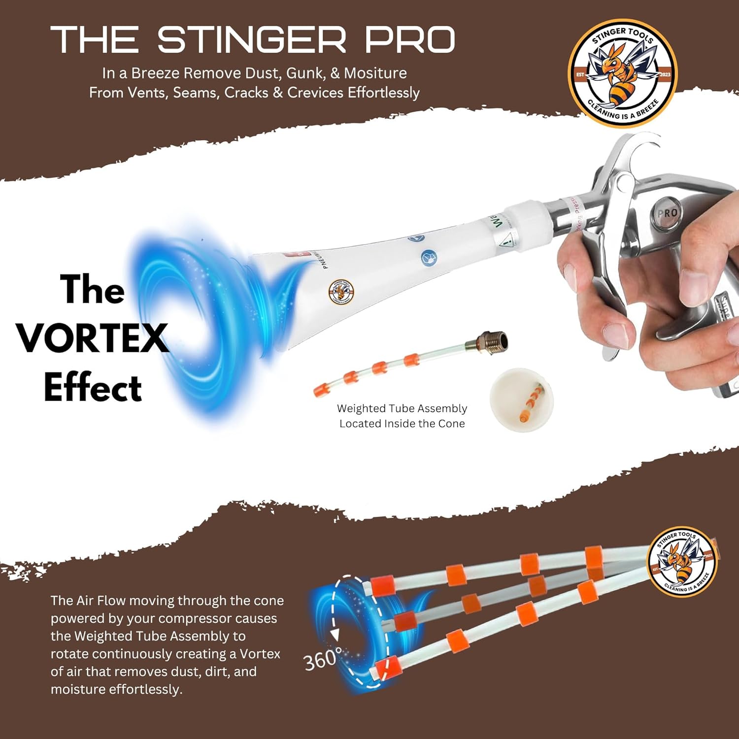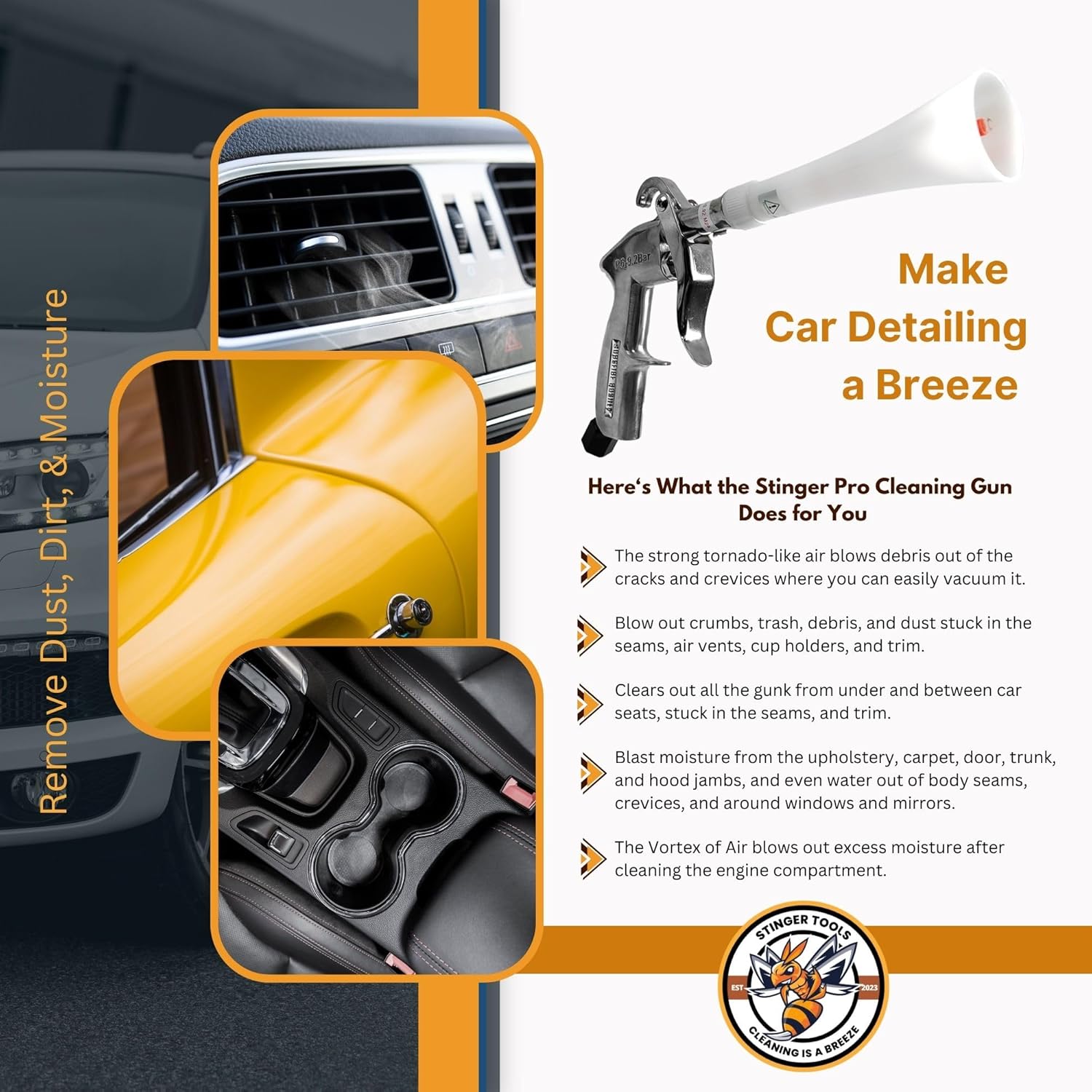 Deep Clean Tight Spaces with the Stinger PRO Dry Cleaning Tool The battle against dirt extends beyond what meets the eye for professional car detailers. Tiny dust bunnies, crumbs, and hidden moisture in tight crevices can sabotage meticulous detail work. Enter the Stinger Pro Cleaning Tool, your new weapon against these seen and sometimes unseen enemies. Blast Away Hidden Messes in Tight Spaces: The Stinger PRO unleashes a concentrated air blast like a mini-tornado, cleaning even the most challenging areas like vents, seams, and crevices. No more dust bunnies, crumbs, or moisture – just a flawlessly clean and impressive finish. Precision Cleaning Made Easy: It is lightweight with an ergonomic design that keeps you comfortable even during long detailing sessions, making precision cleaning a breeze. Our high-quality materials and robust design withstand the rigors of professional detailing. Its low maintenance requirements and readily available replacement parts ensure you’ll have peace of mind knowing it’s always ready for action. Car Detailing At Its Best: Interior: Blow out dust, trash, dust, or other unwanted gunk from under and between car seats, seams in the dashboard and trim, or wherever unseen tiny dust bunnies hide. Then, all that muck is ready to vacuum up. Exterior: Forget the hand drying as you blast water out of doors, trunks, hood jambs, and body seams around the mirrors and windows, avoiding drip marks. You can even dry out the engine compartment. Specifications: Included: White Cone, 1/4 inch Air Inlet Connector. Size: 5.4 x 4.8 x 8.5 inches. Weight: Less than 1 lb. Air Compressor Required for Operation: Minimum pressure: 60-90 PSI, CFM rating: 3-15 CFM, Constant pressure is critical for optimal performance.
