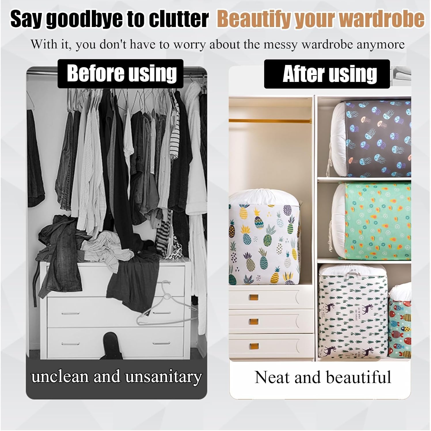 ● Clothing Organization Solution: Non-Woven Wardrobe Organizer with Zipper and Mobile Quilt Storage Basket. This Clothes Storage Bin features a Zipper Lid and Foldable Non-Woven Construction, providing ample space for your storage requirements.● Versatility for Various Settings: This storage solution accommodates a wide range of items, including quilts, pillows, garments, blankets, towels, toys, and more. It effectively safeguards your belongings while optimizing storage, liberating valuable closet and drawer space.Key Features:● Smooth Dual Metal Zippers: Equipped with two-way smooth zippers for added convenience and easy access.● Double Reinforced Carrying Handle Design: Sturdy webbing handles reinforced for durability, ensuring effortless lifting and transportation.● Clear Visual Design: Dual openings for convenient retrieval. Clear side windows enable quick identification of sweaters, blankets, or other essentials.Product Specifications:● Material: Cotton, Oxford● Fashionable Elements: Solid Color● Style: Foldable● Aesthetic: Simple, Japanese-inspired● Suitable for: General Public● Applicable Spaces: Bedroom, Wardrobe, Cloakroom, etc.● Suitable Items: Underwear, Coats, Suits, Sweaters, QuiltsPackage Contents:1 x Storage BoxUseful Recommendations:● Product images may not include decorative elements.● Discrepancies in color may arise due to monitor settings and photography angles.● Manual measurements could result in a 3-5cm variance; your understanding is appreciated.● Don't hesitate to contact us for any inquiries; we're dedicated to addressing your concerns within 24 hours.