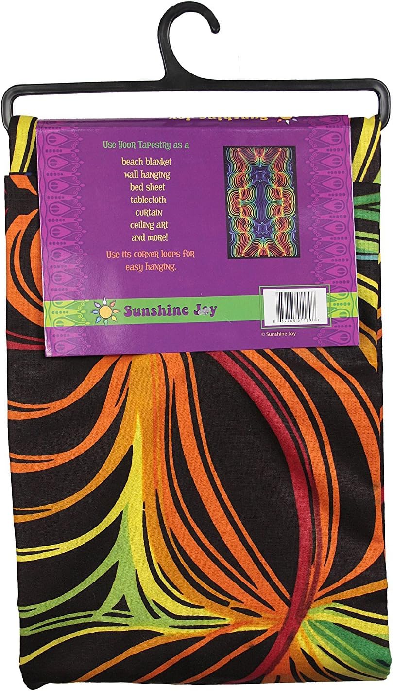 3D Rainbow Ripple Tapestry -- Sunshine Joy’s 3-D Tapestries take beautiful, large-scale art and design into another dimension. You stare at your new Sunshine Joy tapestry intently as it hangs on your wall. You marvel at its intricate and well-crafted design and love the beauty it brings to your environment. The colors and artwork are inspiring. One would never expect anything more from this printed fabric. But then, you break out Sunshine Joy’s 3-D Glasses and WOW. You have gone deep down through the rabbit hole and into another dimension. It appears that you can get your hands behind the colors, and it’s fun watching your friends do just that. -- The designs look beautiful to the naked eye and incredible with our 3-D glasses -- In India, they are what locals use as bedcovers. People use them at home for tablecloths, bed-sheets, room dividers, curtains, window treatments, ceiling decor and to quickly cover up. - The corner loops make our tapestries the perfect multipurpose outdoor traveling companion. Secure your picnic sheet . At festivals, stake out an appropriate amount of space for your friends. Tie up a sunscreen at the campsite. Great at the beach as a windproof beach sheet or sun cover-up. 100% Cotton. Our tapestries are printed, not quilted or woven. They are hippie Indian tapestries. Thin as sheet. Good, tight power loom construction. Hemmed edges. The printing process is unique to India. Each tapestry has its unique imperfections. Sunshine Joy's tapestries are printed with a special soft fiber reactive dye. This is the same soft feeling of your favorite tie-dyed T-shirt. Some colors may show through the back side to give the impression that they are double sided with one side lighter than the other. Actually, they are only printed on one side. -- Size is approximately 5 feet by 7.5 feet. 60 inches by 90 inches 152 centimeters by 228 centimeters 1.52 meters by 2.28 meters. Fits a twin XL college dorm bed.