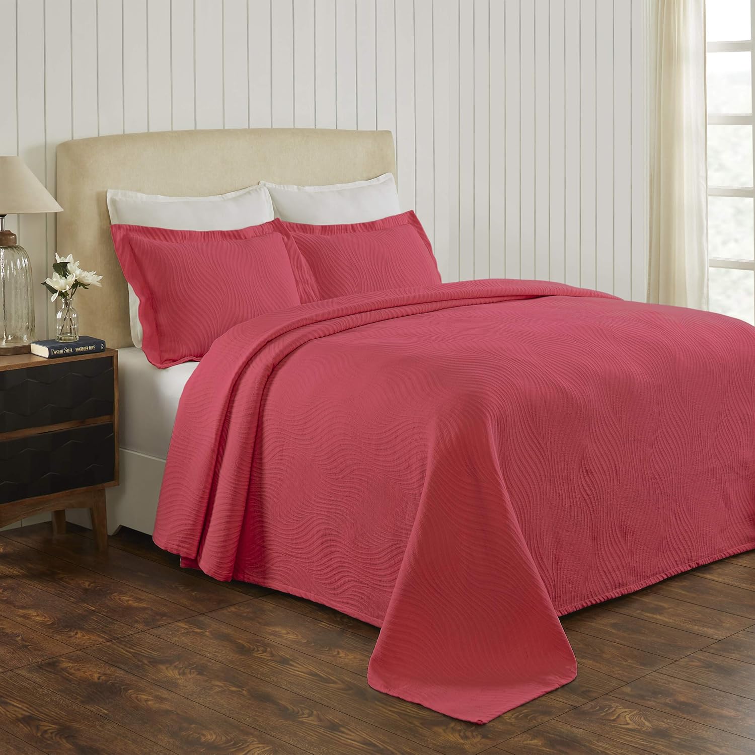 Create a dreamy bedroom retreat with the elegant design of the Cascade 3-Piece Cotton Bedspread Set. This lightweight bedspread can be used year-round either on top of the bed while simultaneously working as a decorative accent or used as an added layer during the colder winter months. This textured wave design is crafted from 100% Cotton and is woven into a raised matelassé pattern on a jacquard loom. Two matching pillow shams mirror the design of the bedspread for a fully coordinating look (Twin size includes one pillow sham). Available in your choice of solid color options, this detailed pattern will add subtle elegance and charm to your favorite space.