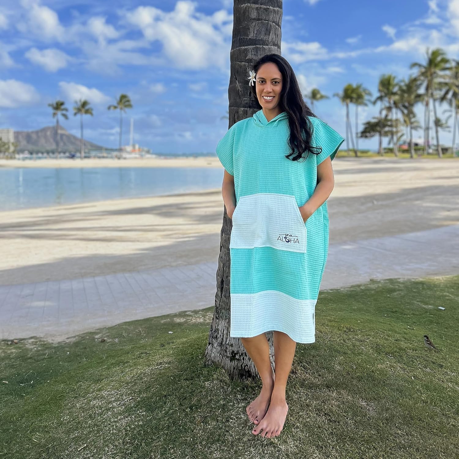 Do you ever see surfers on the side on the road changing in and out of their wetsuits using nothing but a towel around their waist and wonder how you will do that as a lady? As a woman, it is extremely difficult and frustrating! So you decide to buy a surf poncho to make it easy to undress and change discreetly, only to find that all the designs and colors are catered to men! Sea Aloha was born out of necessity to create high quality, functional, comfortable, and aesthetically beautiful products for the female surfer. Our ponchos are made with 100% cotton. They are comfortable, hypoallergenic, and doesn’t cling to your skin. Due to the waffle pattern, sand is less likely to stick to your poncho. The fabric is absorbent and dries quickly. It is thick enough to wear in the winter and thin enough to be wearable in the summer. For your next vacation, it is easy to pack in a suitcase or throw it in your surfboard bag. The poncho is versatile and has many uses. It is machine washable and ok to use in dryer. Buy for yourself or as a gift. It’s like having your own portable changing room everywhere you go. Thank you for supporting a woman-owned US small business!