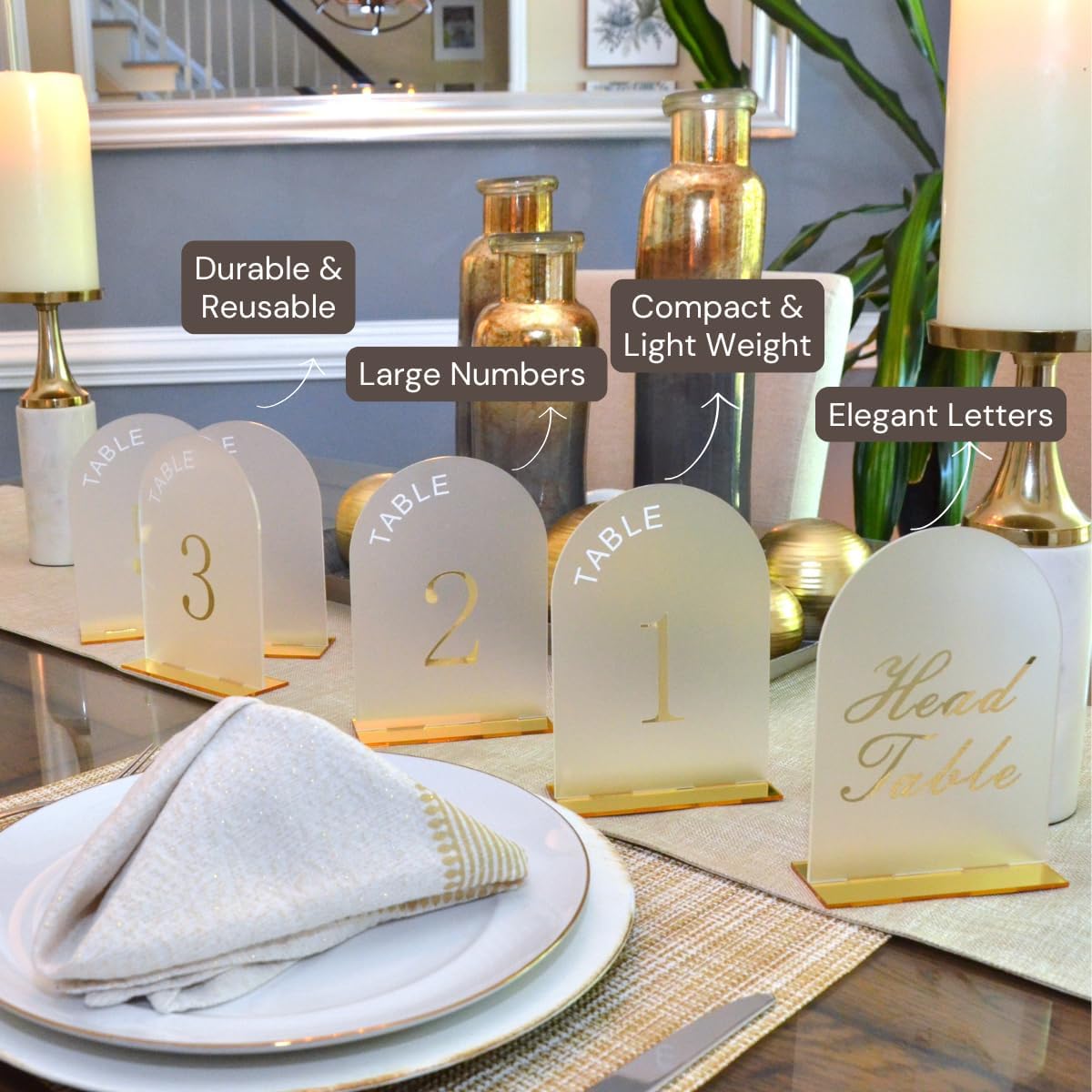 Get a set of 1-20 table numbers for wedding reception ideal for creating well organized assigned tables for your guest! You will received a 5x7 acrylic sign holder plus head table sign ensuing a delightful experience from classic elegance to contemporary look and can be reused adding value to your next event planning. Our clients love our product! Our modern style arch acrylic 5'x7' table numbers for wedding reception are easily visible on the table. Reserved table signs for wedding will help for a faster seating giving a good impression to your special guest! Elevate your event with our good quality acrylic wedding table numbers, these seating numbers saves you time and effort adding elegance and luxurious feel. Our table numbers will resist one party after another. When you get your 20 table numbers you can perfectly reuse such as weddings, birthdays, baby showers, galas, anniversaries, and so many more! The table numbers can be reused for multiple occasions saving you time and money! If you are unsatisfied with our table numbers, please contact us directly. We will replace the wedding acrylic sign or refund to you according to your choice ensuring long term business relationship with our customers!