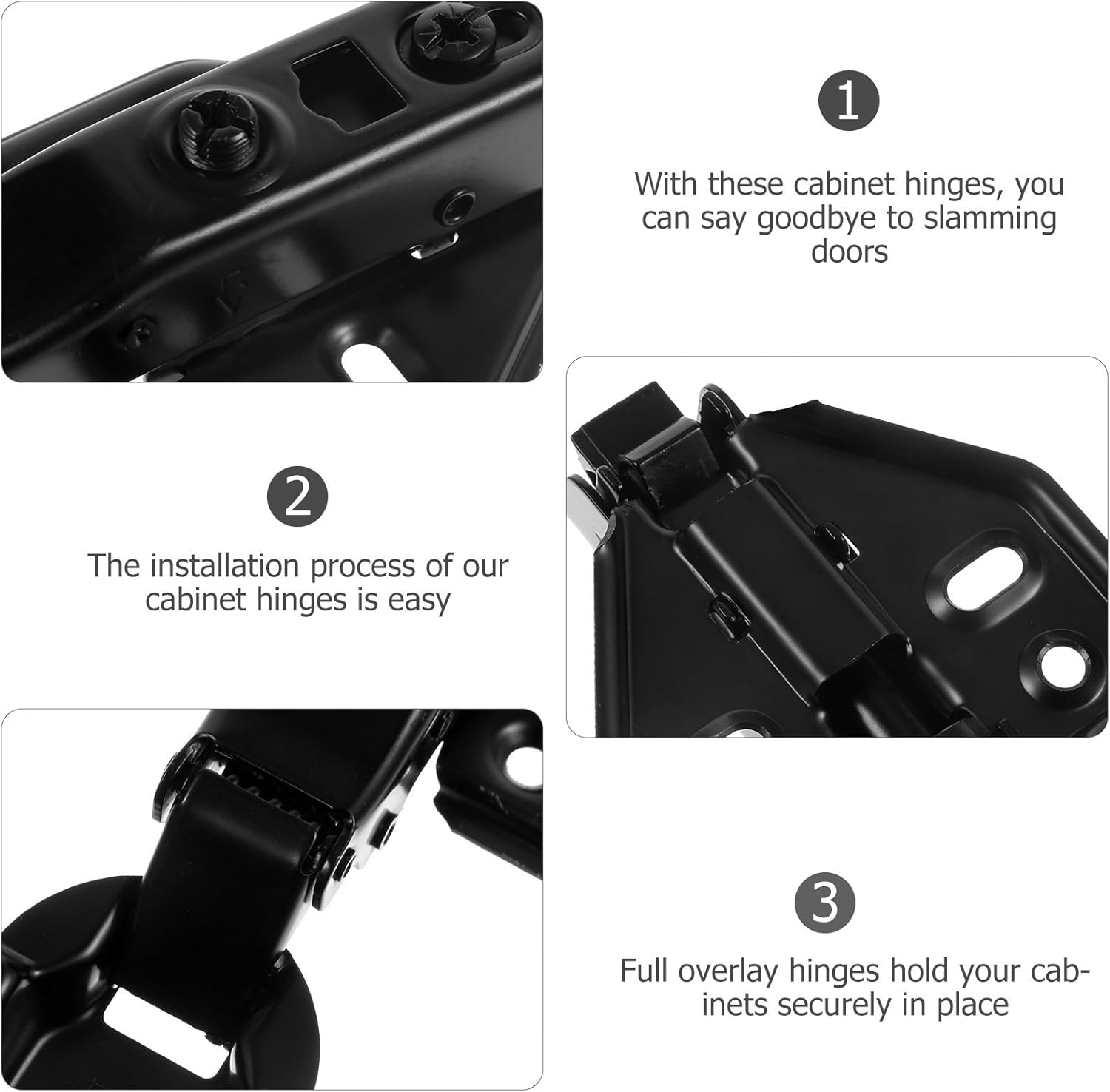 Package Include 2 Cabinet Hinges 6 x Screws Characteristics -Size:12.00X7.00X2.00cm/4.72X2.75X0.79in -Material:Stainless steel -Color:Black -Product Info:Cabinet hinges - The hinges the overall functionality of your cabinets, allowing you to access your kitchen’s contents more easily and quickly concealed hinges for cabinets. - With soft closing cabinet hinges, you can create a cleaner look in your kitchen, cutting down loud and unsightly slamming concealed cabinet hinges. - Soft closing hinges provide even and slow closing speeds, giving you comfortable control over your kitchen cabinets hinges for kitchen cabinets. - Soft closing hinges reduce the noise of kitchen cabinets, making them an excellent upgrade for apartment living overlay cabinet hinges. - Mechanism hinge that your cabinet doors remain correctly aligned, preventing any unnecessary gaps or unevenness rotating concealed hinges.Goods Informationoverlay hinges The cabinet hinges have widely used, suitable for bathroom and kitchen cabinet, ensuring a perfect fit for your kitchen or bathroom.kitchen cabinet hinges Stainless steel cabinet hinges for easier installation and has a smooth opening angle, ensuring your cabinet doors are properly aligned, open and close slowly