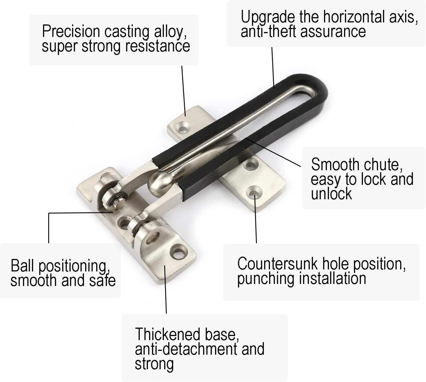 Material:Zinc alloy Color:Satin Nickel Function:Locking door leaf and safe-guarding Features:Elegant and durable Available for:All kinds of doors Package Included:1xSecurity Door Guard,Screws included Warranty Description :Limited Lifetime Replacement Warranty Installation Instruction: 1.Make sure both the door and the wall must be flat and at an even surface with each other.If there is door with molding,you should prepare some pieces of washers that match the holes in the hardware. 2.Figure out where to install the security door guard and drill holes. 3.Install the lock on the trim side first and then line up the ball part on the door. 4.Tighten each screw,done. TOGU security door guard is great-especially for wanting to increase the security of your front door,it's sturdy and reliable and gives you sense of security to sleep with less worry that someone can enter by just picking the lock.This mechanism allow door to be opened slightly for viewing.A must to have one for a house if you have a child who likes to open the front door or if you are living alone.They are easier to open and close than a traditional chain or bolt,once installed,this security hardware start to protect your home and loved one. TOGU Hardware Company provides high quality and reasonable price household door hardware, kitchen hardware and bathroom hardware, we sincerely hope that we could have the honor to contribute all our intelligence and effort to work together with you to make your home comfortable, safe, relax and artistic.