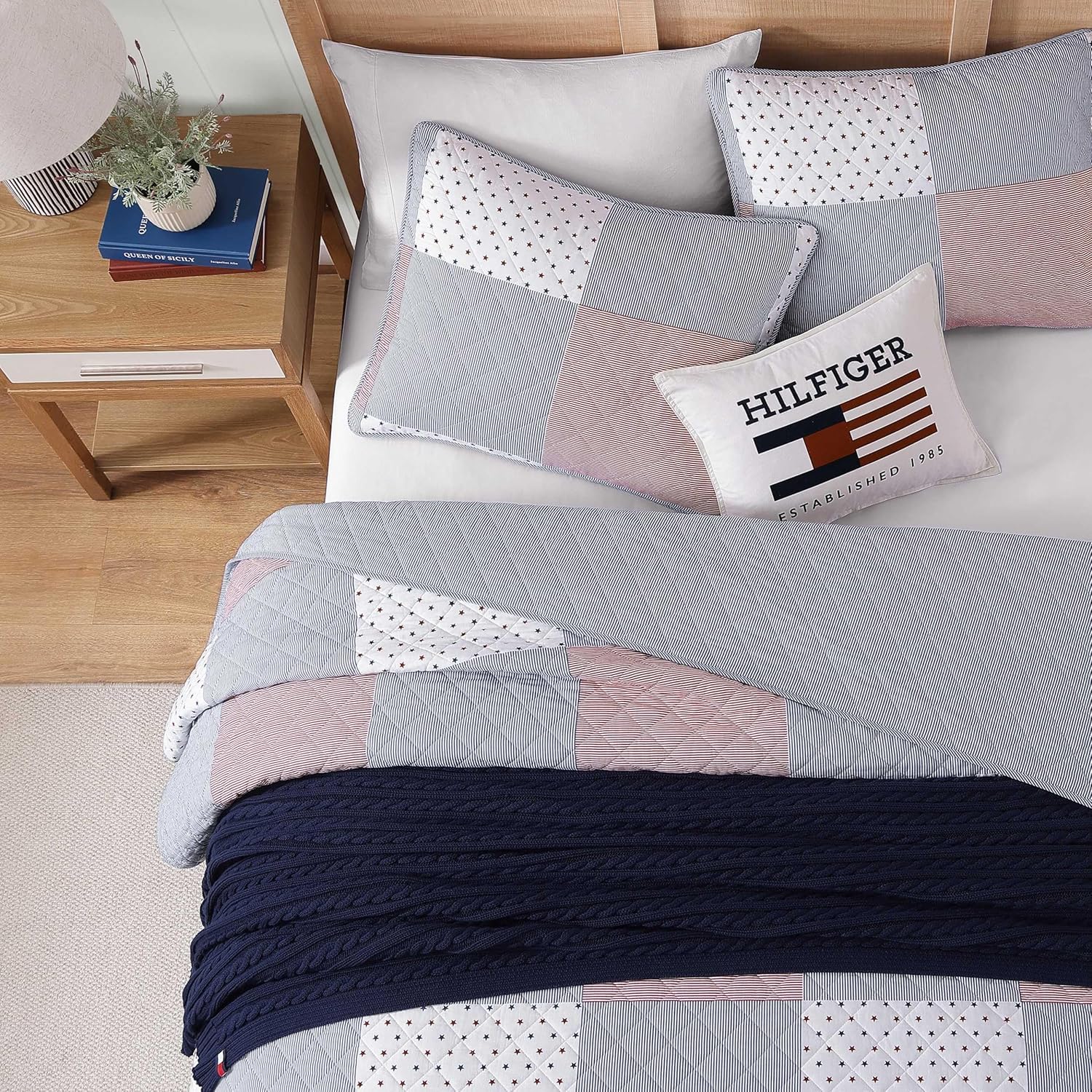 Bring the charm of timeless American style into your bedroom with the Tommy Hilfiger ithaca Americana patchwork quilt set. Inspired by classic collegiate and heritage influences, this reversible design combines star and dot motifs with tailored stripe detailing in crisp white, deep blue, and vibrant red tones, creating a look that feels both iconic and confidently modern. The patchwork front adds visual interest and dimension, while the coordinating Ithaca Stripe reverse offers a clean, versatile styling option to refresh your space. Crafted from 100% cotton percale, the quilt features a smooth, breathable handfeel that’s lightweight and comfortable for year-round use. The finely woven percale construction delivers a crisp, polished finish, while the quilted stitching adds subtle texture and structure to your bedroom décor. Ideal for layering on its own or pairing with coordinating bedding, this quilt set works beautifully in classic, coastal, or contemporary interiors. Each quilt set includes 1 quilt and 2 shams (1 sham for the twin). Machine washable for easy care, the ithaca Americana patchwork quilt set delivers dependable comfort, lasting quality, and the timeless American heritage that defines Tommy Hilfiger.