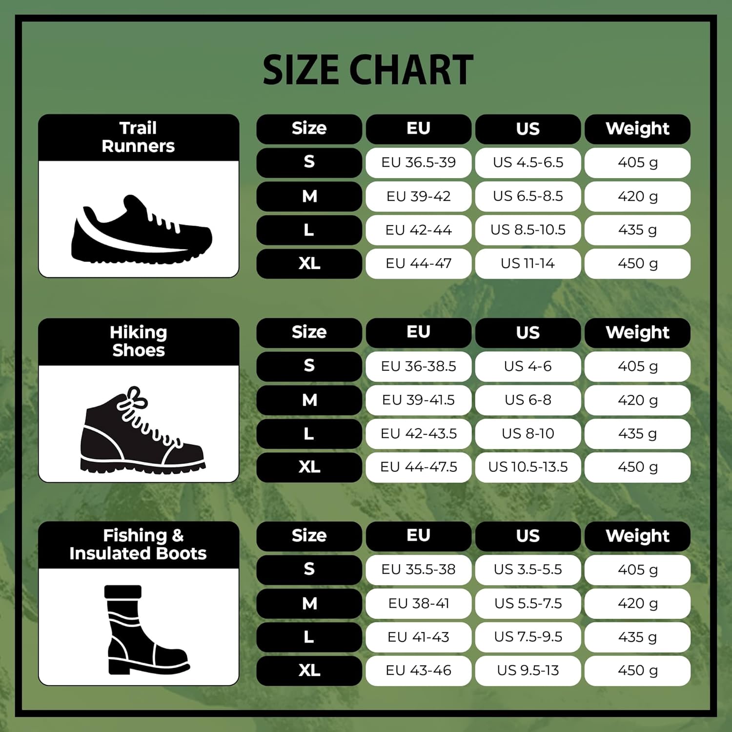 Yatta Life presents a crampon's anti-slip ice grip for snow and ice hikes, nordic walking, and trail running. These track spike grippers offer a powerful solution for the toughest weather conditions. It has used stainless steel trail ice spikes for shoes and chains that are coupled with a unique spike. This anti-slip ice grip gives you the freedom to overcome bad weather and enjoy your outdoor activities without worrying about slipping. Our ice grippers are multifunctional and are very suitable for outdoor activities like snow hunting, jogging, hiking, snow shovelling, etc.Besides It has full-sole coverage with traction that helps to maintain traction while walking in the snow without any risk. These crampon ice grips are the perfect choice for travellers and adventures who don’t want water or ice getting in the way of their outdoor adventures. This anti-slip shoe grip is easy to put on and take off as well as is compatible with a wide variety of hiking footwear.Product Benefits:Simple to useAvailable in different colors & sizesMade of rubber elastomer with elasticityProvide safety while walking on the snowperfect solutions for your winter adventuresHeavy-duty trail spikes 14-spike ice grip climbing spikesStainless steel spikes & chains to ensure maximum durabilityThe dynamic flex-chain with the tough shoe harnesses, they are easy to put on and take off as well as being compatible with a wide variety of hiking footwear. Unlike the rest, they stay firmly in place to give you the extra traction and support you need to comfortably walk, run, hike, or climb.Overcome the weather and enjoy your outdoor activities with Yatta Life heavy-duty crampon ice grips!