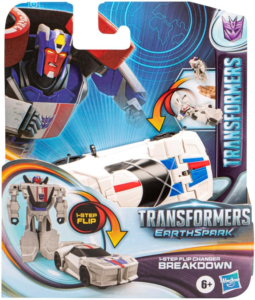 Experience a Transformers conversion like never before with the Transformers: EarthSpark 1-Step Flip Changer Breakdown action figure! Convert the Breakdown toy from robot to racecar mode by flipping the bot into the air! When the robot toy sticks the landing after an exciting 1-step flip motion, the conversion to racecar mode is complete. With a 1-step manual conversion, kids can convert from racecar mode back to bot mode—then do it all over again! Look for more 1-Step Flip Changers Transformers action figures (each sold separately, subject to availability) featuring popular characters from the Transformers: Earthspark show, an animated series that centers on two human kids as they forge a connection with Transformers robots like never before and work alongside fan favorites like Optimus Prime and Bumblebee! Great gifts for kids 6 and up! Transformers and all related characters are trademarks of Hasbro.