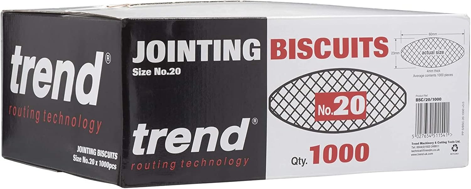 Theses premium quality die-cut beech biscuits in the popular No20 size are designed for heavier construction applications, edge jointing, kitchen carcassing, and furniture framework. This pack of biscuits comes in a box of 1000, making it ideal for the trade workshop that uses biscuit joinery on a regular basis. Biscuit joining has proven to be one of the strongest, fastest, safest and most accurate ways to join hard and soft woods, plywood, composition boards etc. Compared to dowelling, biscuit joinery is faster and more precise. The biscuits are made of laminated beech which is then compressed before being die cut. Beechwood biscuits expand up to 20 per cent when in contact with a woodworking adhesive. (e.g. PVA Glue).