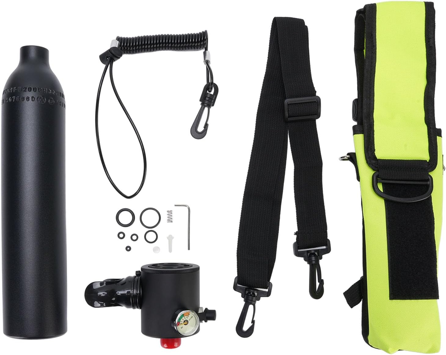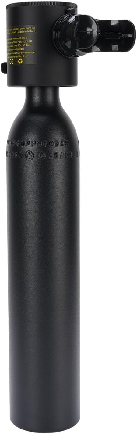 [Adequate Oxygen Supply] Dependable tank ensures safe diving and full immersion in the underwater world. [Customizable Breathing Rhythm] Allows divers to adjust breathing for enhanced underwater experience. [Versatile Diving Gear] Ideal for scuba diving, snorkeling, and other underwater activities, a must-have for diving enthusiasts. [Compact 0.5l Tank] Lightweight and easy to carry, perfect for divers on the go. [Premium Silicone Mouthpiece] Crafted from food-grade silicone for odorless, snug fit, and durability. Spec: Item Type: Underwater Breathing Diving Gear Material: Aluminum Alloy, Silicone Maximum Inflation Pressure: 3000PSI 200BAR 20MPA Package List: 1 x Oxygen Cylinder 1 x Breathing Mouthpiece 1 x Cylinder Bag 2 x Anti Loss Strap 1 x Instruction Manual 1 x Hex Wrench 6 x Rubber Circle 3 x Other Accessory Note: Usage Details: Oxygen cylinder pressure must not exceed 20 MPa (i.e., 200 BAR or 3,000 PSI as shown on the pressure ). Before boarding the airplane, please separate the breathing valve from the bottle. You need to press the top first, and then the bottle will be separated after the pressure relief is completed.