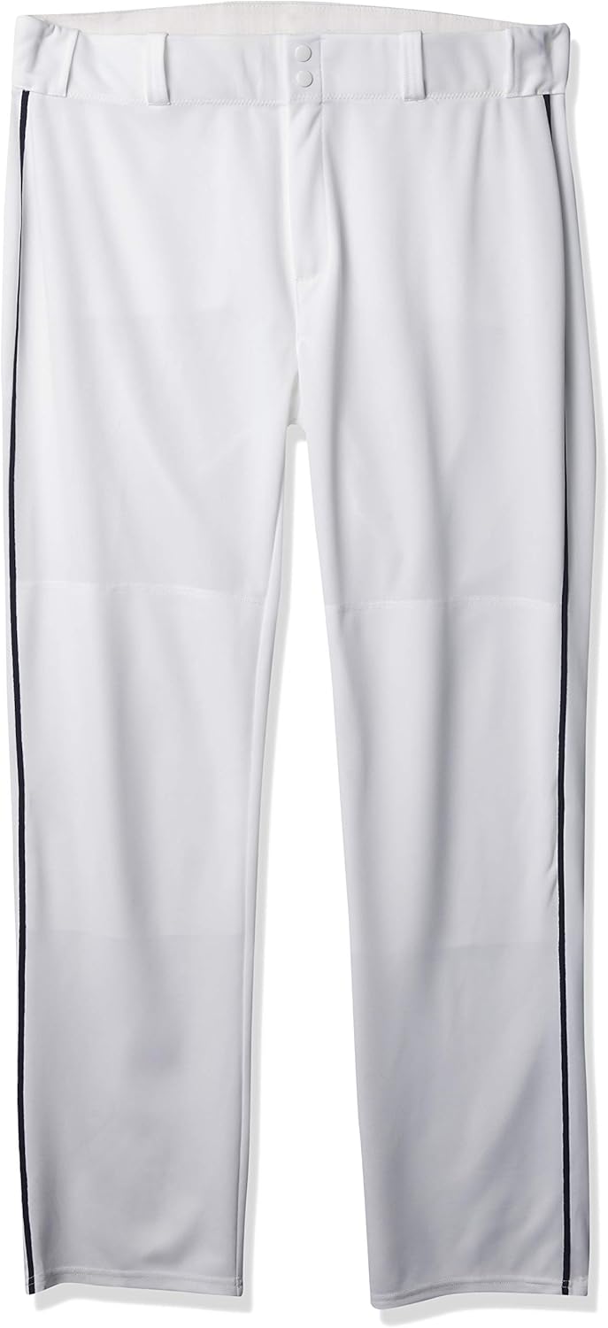 Adult durable Baseball pant with Braid down both side of pants. Single row, colored 3/16 inch soothe sewn down both sides of pant. Double knee construction with five Pro-Style belt loop. Relaxed fit with wide leg and open bottom non-traditional pant.