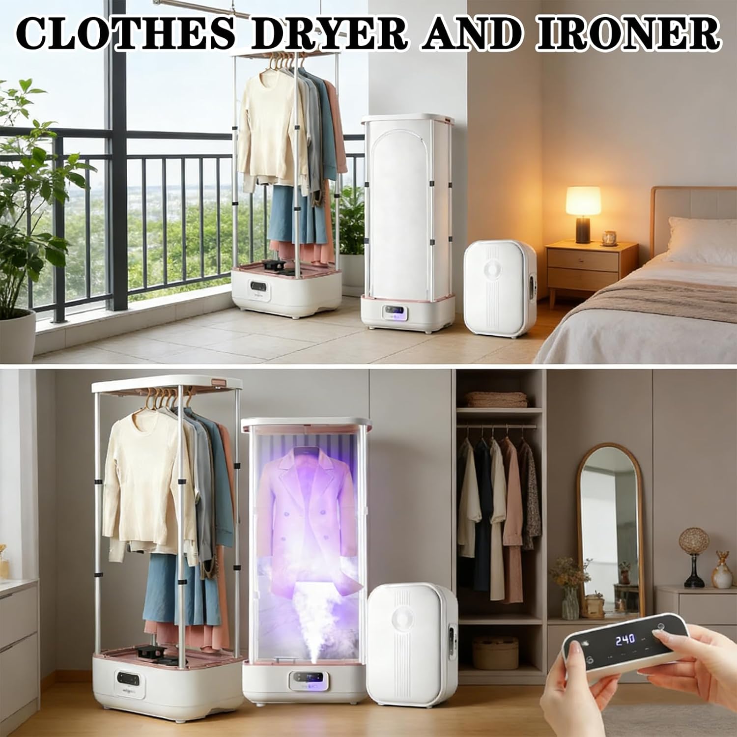 Discover the advanced solution for modern garment care with this innovative 2-in-1 automatic ironing machine and steam closet for clothes. This versatile clothes dryer and ironer system combines advanced steaming technology with practical storage functionality, creating an all-in-one steam closet that refreshes, dries, and helps reduce odors from your favorite garments. Experience the convenience of having a personal garment care system that efficiently handles your daily wardrobe maintenance needs.Advanced Features & Capabilities:Powerful Steam Performance: 900W high-efficiency automatic iron machine helps remove moisture and refresh fabrics, ideal for damp clothing and reducing wrinkles.Intelligent Garment Care: Functions as a clothes folding machine and laundry folding machine station with fabric refreshment and odor reduction.Smart Control Operation: LED remote control with auto shut-off makes this automatic clothes folding machine safe and user-friendly.Space-Saving Design: Collapsible folding clothes machine transforms to compact size while maintaining generous capacity.Simplified 3-Step Process: Easy add-water, load, and activate operation makes this cloth folding machine accessible to all users.Automated Safety Sensing: Built-in detection ensures this automatic clothes folding machine operates safely and efficiently.Specifications:Product Name: Garment Care SystemRated Power: 800W (Drying)/900W (Steam)Dimensions: 60×45×150cm (Expanded) / 45×35×60cm (Folded)Weight: 6.8 kg (Net) / 8.9 kg (Gross)Important tips:1. Due to factors such as monitor brightness and light settings, the actual color of the item may be slightly different from the picture shown on the website.2. Please allow slight deviations in the measurement data. Thank you for your understanding.3. If you have any questions about our clothes drying equipment, please contact us by email and we will reply you within 24 hours