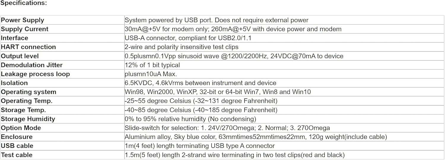 The WS232UP USB-HART Modem provides a complete and flexible PC communication link to HART networks and power kit and loop resistor, for commissioning, servicing, calibrating, or acquiring data from any HART instrument or transmitter. The WS232UP is developed based on BELL202 modem standard, this external interface is rugged and compact and ideal choice for field service, commissioning, engineering, training, table top shows, lunch and learns and demo cases. Packing List: 1 x USB Hart Modem 1 x Free Pouch 1 x Manual 1 x CD