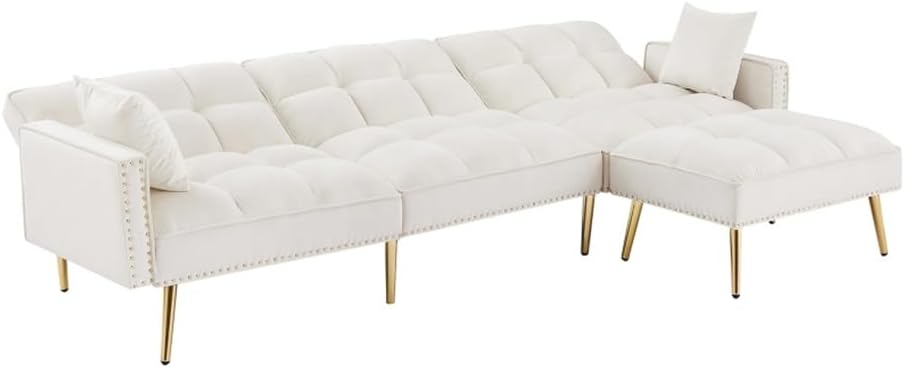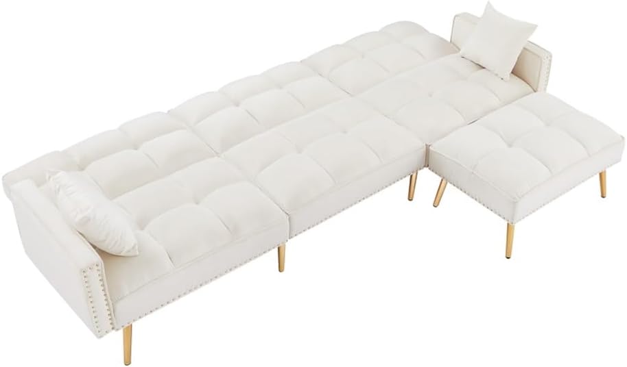 Comfortable Velvet :The surface of our sofa is crafted with comfortable velvet, which is soft in texture and offers you a relaxing feeling .Seat cushions with high-density sponge , it makes the sofa more comfortable to sit on.Sturdy Structure : The frame of this sofa is solid wood and manufactured wood .Supported by metal legs to ensure the sturdiness and the weight capacity can be up to 800 lbs .Nailhead trim and tufted cushion design provide warmth and charm for your office or living room. Elegant line design can fit in any kind of decor theme.This sectional sofa backrest have 3 adjustable positions.if you want to watch TV in your living room you can adjust the back rest if you want to take a nap you can adjust the angle to 180 °as a bed. All in all, the adjustable back rest can meet your different needs in your life.Perfectly match with most home decor. Suitable for living room, bedroom, dining room, study and hall.Assemble Easily: the packages contain all the hardware parts, no extra tools needed.Upholstery Material:VelvetLeg Material / Color:Metal / GoldenSeat & Back Fill Material:FoamFrame Material:Solid + Manufactured WoodSeat Construction:Sinuous Springd+serpentine springSize: as shownSet Includes1*Sofa (no other presentation items included).Notice:1. Due to manual measurement, please allow 2-3% error, before you bid, please make sure you don't mind.2. The color may vary due to different displays, please refer to the actual product.