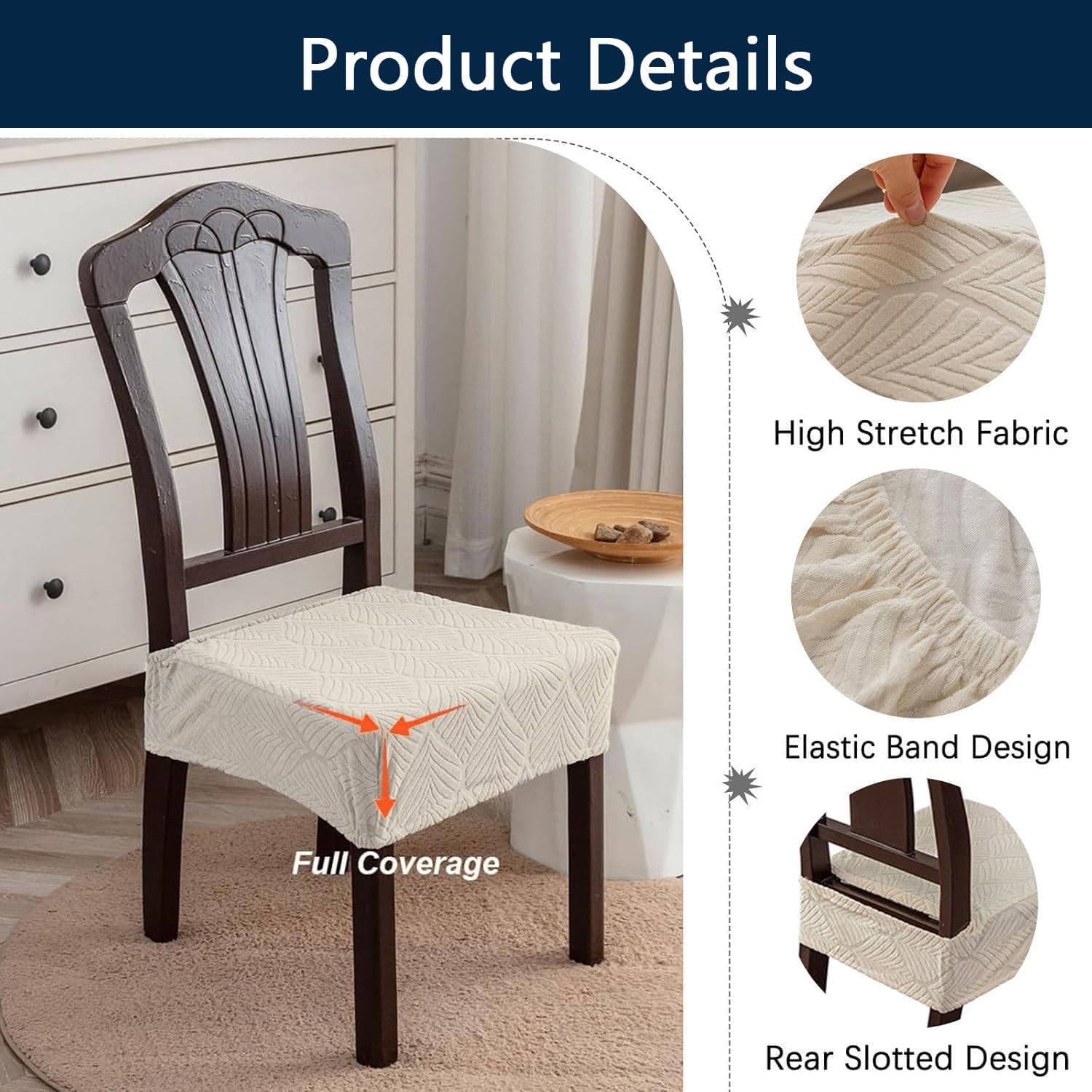 Stretchy Fit: Crafted with high elasticity to snugly fit most dining chairs. Comprehensive Protection: Shields chairs from stains, scratches, wear, and spills, extending their lifespan. Material: Polyester and Spandex Size: Seat Length: 38-46cm (15-18.1in) Seat Width: 38-46cm (15-18.1in) Seat Height: 7-10cm (2.8-3.9in) Please refer to the size guide in the images for accurate measurements. Package Includes: 2/4/6 x Dining Chair Seat Covers Cost-Effective: Revitalizes old chairs for a fresh look, saving money on replacements. Versatile Use: Perfect for family dining rooms, hotels, weddings, events, and more. Notes: Colors may vary slightly due to lighting and screen differences. Allow a 1-3cm measurement deviation due to manual measuring.