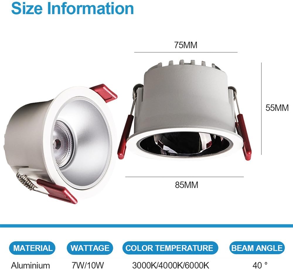 [Product Information]Material: Aluminum.Color: White/Black (as shown in the picture).Product size: (Please refer to the size chart).Diameter: 85mm, height: 55mm, cutting size: 75mm.Size conversion: 1 millimeter=0.039 inches.Light source type: LED chip.Color temperature: (3 color temperatures to choose from).White light: 6000K-6500K.Neutral light: 4000K-4500K.Warm light: 3000K-3500K.Beam angle: 40 °.Color rendering index: RA ≥ 92.Installation method: embedded.Service life: 50000 hours.Power: 7W/10W.Voltage: 90-260V.Applicable space: bar, restaurant, kitchen, study, living room, bedroom, bar, coffee shop, etc.Packing list: 1 * Downlights.