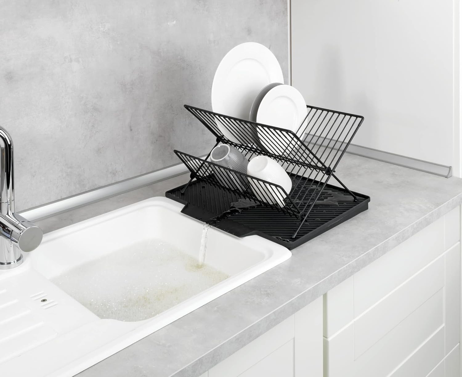 Who washes by hand knows the problem: where to go with the dripping dishes? The Nelia dish drying mat with dish drainer from WENKO offers the perfect solution directly on the sink. The two-piece dish aid guarantees the orderly drying of plates, cups etc. and at the same time ensures that there are no water pools on the kitchen worktop. The Nelia dish drying mat with non-slip effect is an ideal lateral extension of the sink. The special feature: thanks to the inclined surface of the plastic drying mat and the clever groove structure, the draining water flows freely into the sink. Your work surface remains free from water pools and stains. To avoid the need to stack freshly rinsed dishes, the drying mat is complemented by a powder coated metal drying rack that fits snugly on the mat. The crockery can therefore be easily drained and dried on an area of 34 x 24 x 40 cm (W x H x D). The spacious dish drying rack has two levels. The upper is especially suitable for plates, the lower one for example for cups or small bowls. Cutlery can be placed on the plastic mat. The drying mat and dish rack can also be used separately. Especially practical: the frame can be easily folded when not in use. So it can be stored away to save space. The mat made of high-quality plastic and the metal frame complement each other perfectly and give a modern image thanks to their simple, functional design in timeless black. The Nelia dish drying mat with frame will be a real dish aid in your kitchen. Looking for a different format? At WENKO there are other drying mats in different sizes, designs and materials. Material: drying mat: plastic (TPR), frame: powder-coated metal. Colour: drying mat: black, frame: black. Dimensions (W x H x D): 34 cm x 25 cm x 40 cm. Net weight: 1701g