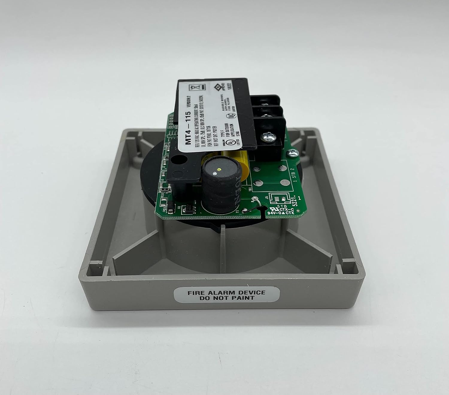Wheelock MT4-115-S MT Multitone Electronic Horn, Gray Housing, One Alarm Appliance with (8) Eight Selective Signals, 99dBA Sound Level, Indoor/Outdoor, Surface or Flush Mounting, 120 VACKey FeaturesDesigned to meet or exceed ADA/NFPA/UFC/ANSI Standards and Accessibility GuidelinesComplies with OSHA 29, Part 1910.165Series MT appliances have IN and OUT wiring terminations that accept two #12 to #18 American Wire Gauge (AWG) wires at each terminal. Inputs are polarized for compatibility with standard reverse polarity type supervisionOne alarm appliance with (8) eight selective signals to provide superior sound penetration for various ambient and wall conditions with two field selectable sound output levelsCode-3 Horn and Tone meet ANSI/NFPA temporal pattern for standard emergency evacuation signalingAudible and strobe can operate from a single NAC circuit or from separate NAC circuits with any of the (8) eight audible soundsWheelock patented MCW Multi-Candela strobes with field selectable c andela settings at 15/30/75/110cd or with single candela 1575cd strobes. The strobes can be synchronized using Wheelock sync modules or power supplies with built in Sync ProtocolSelectable input voltage on non-strobe versions. Strobe versions are factory set for either 12 or 24VDC, with wide- Listed voltage range, filtered (DC) and FWRSpecificationsSound Level: 99dBAVoltage: 120 VACHousing Color: GrayHousing Material: UV stabilized plasticOperating Temperature: –40°F to 150°F (–40°C to 66°C)Mounting Method: Surface or flushIndoor/Outdoor: YesDimensions: 0.76" x 4.06" x 4.06"Product Weight: 0.363 Lb