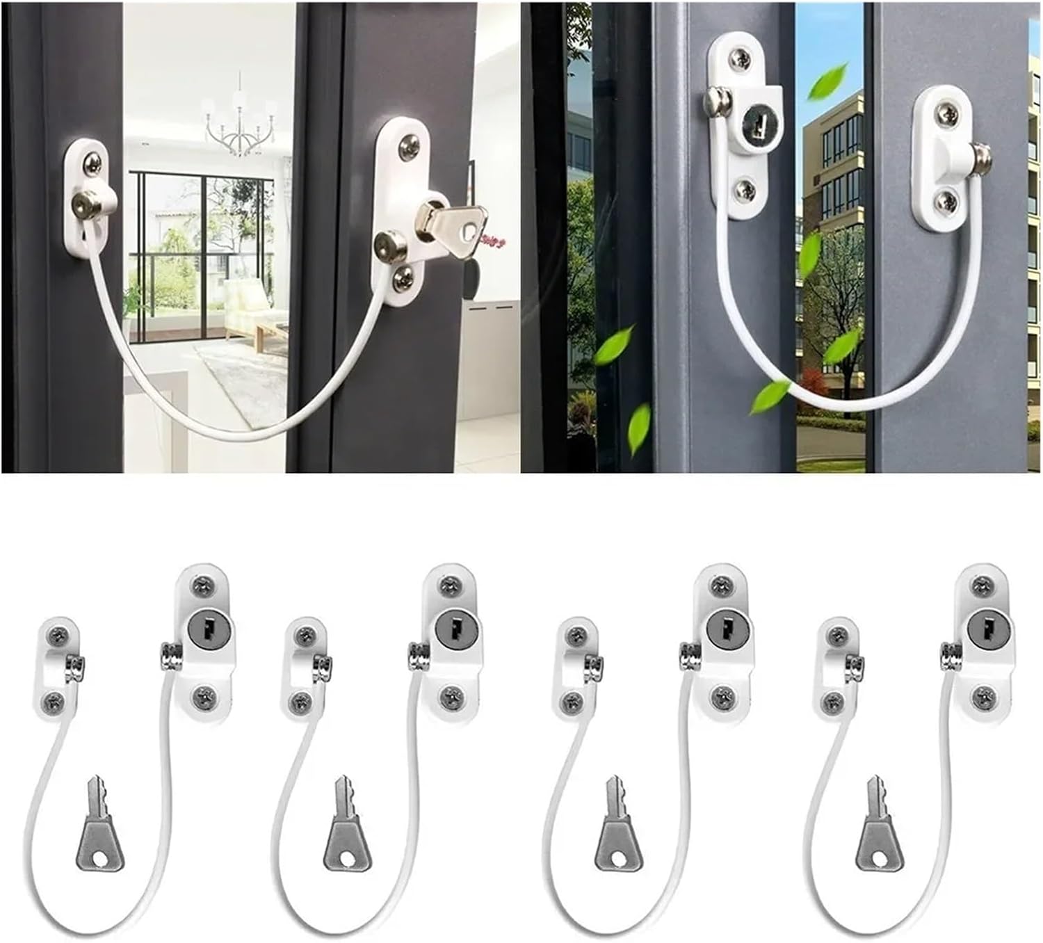 Security --- It Limits the Distance a Window can Open, Ideal for Home, Public and Commercial.Can Be Locked & Unlocked as Required When the Cable is In Place, the Distance of the Window can Open is Limited. And the Window can be Opened Fully after the Cable Being Removed from One End by Using the Key.Wide Application --- Suitable for Most Types of Windows and Small Doors, Suitable for Many Kind of Materials Such As UPVC, Wood, Aluminum and Metal.Material --- Able to Withstand Greater Pressure, not Easy to Damage.Package Including --- 4 x Window Security Restrictor with Keys and Screws