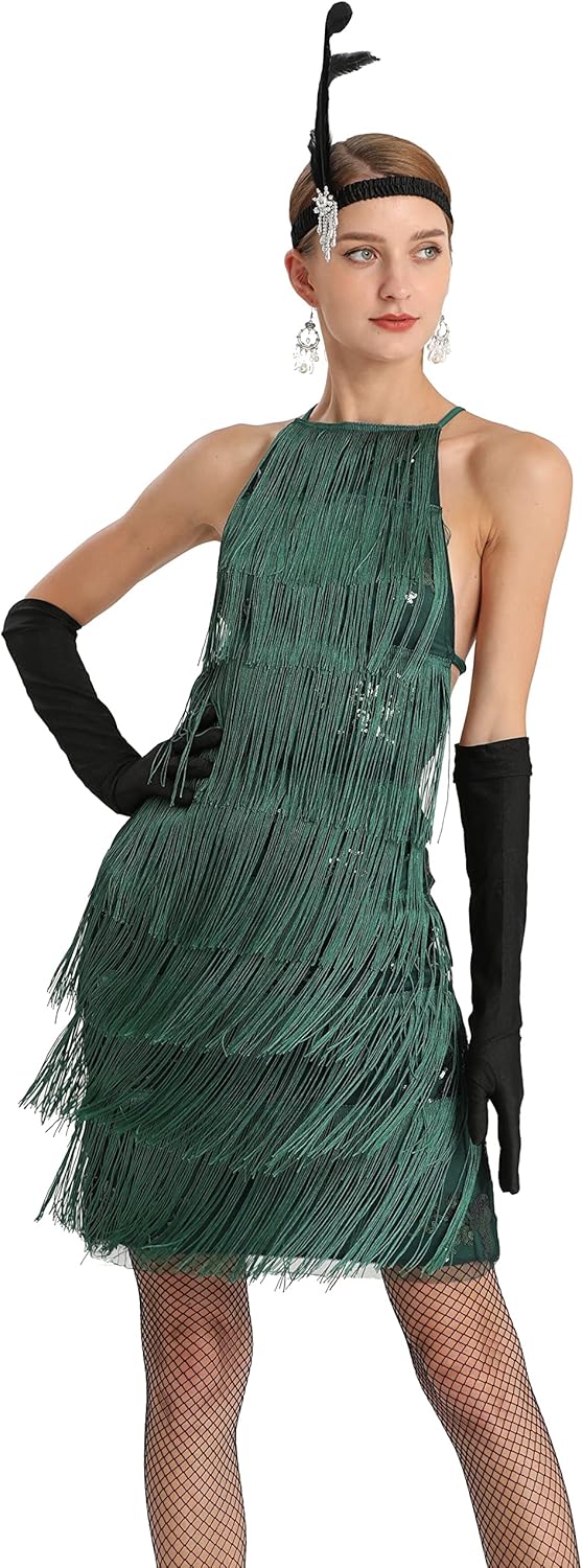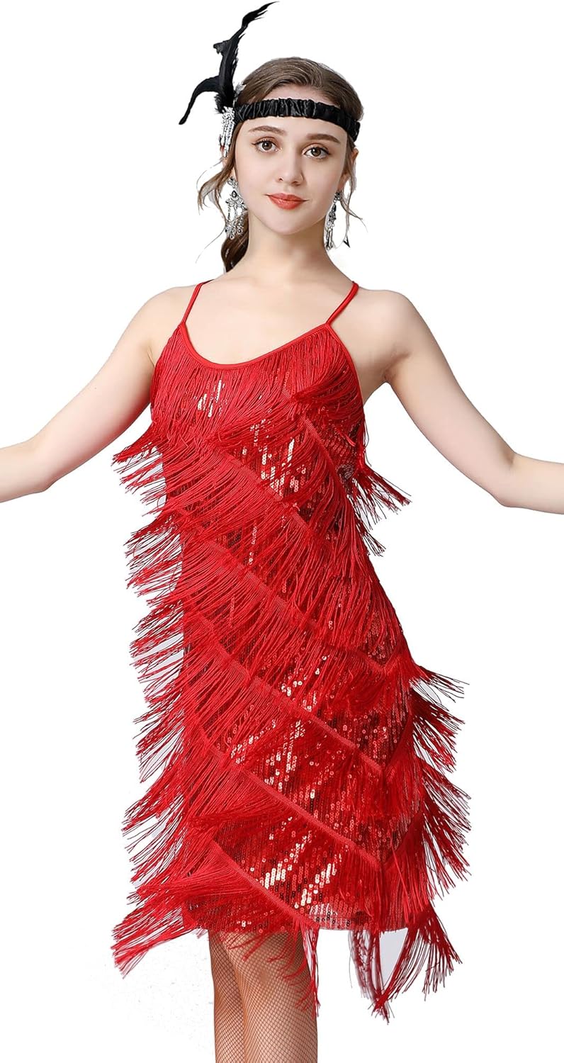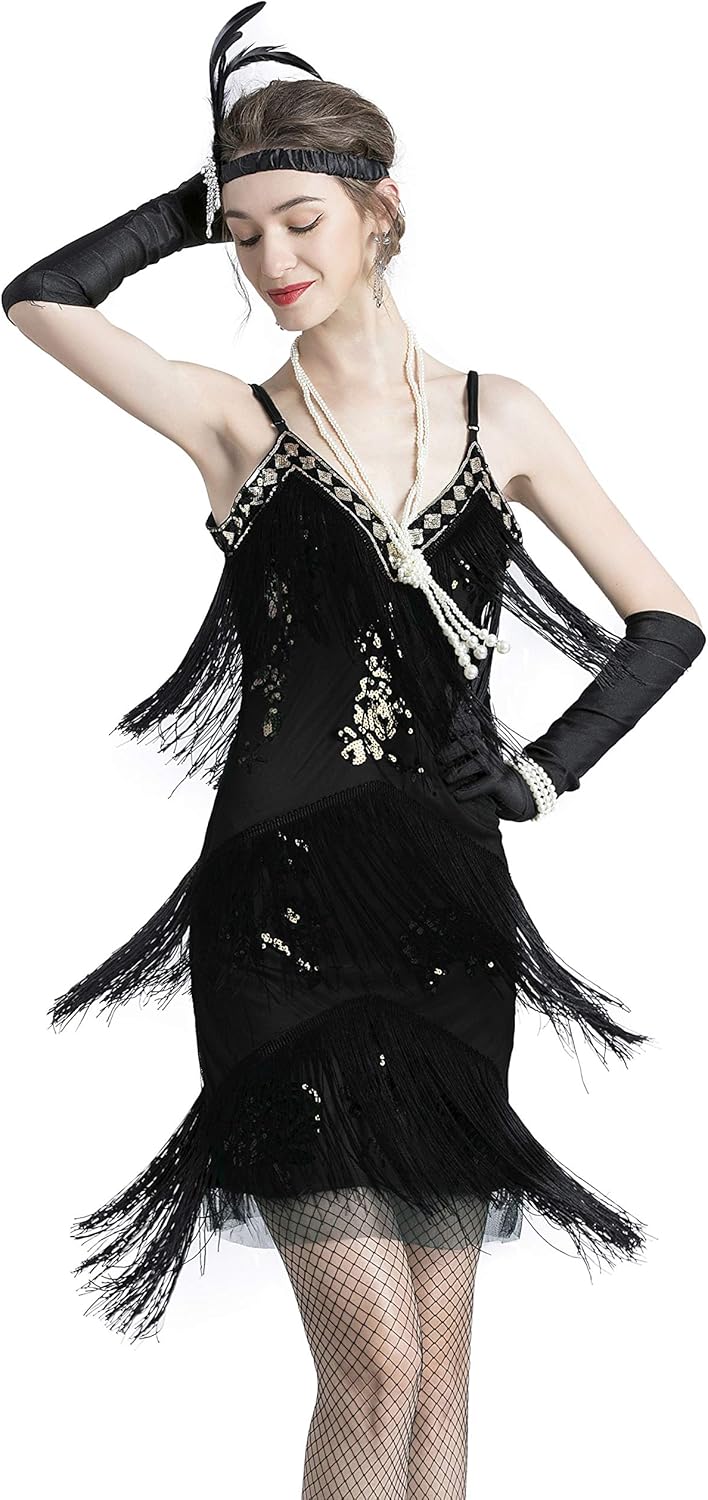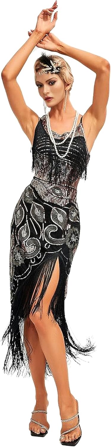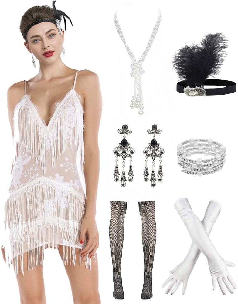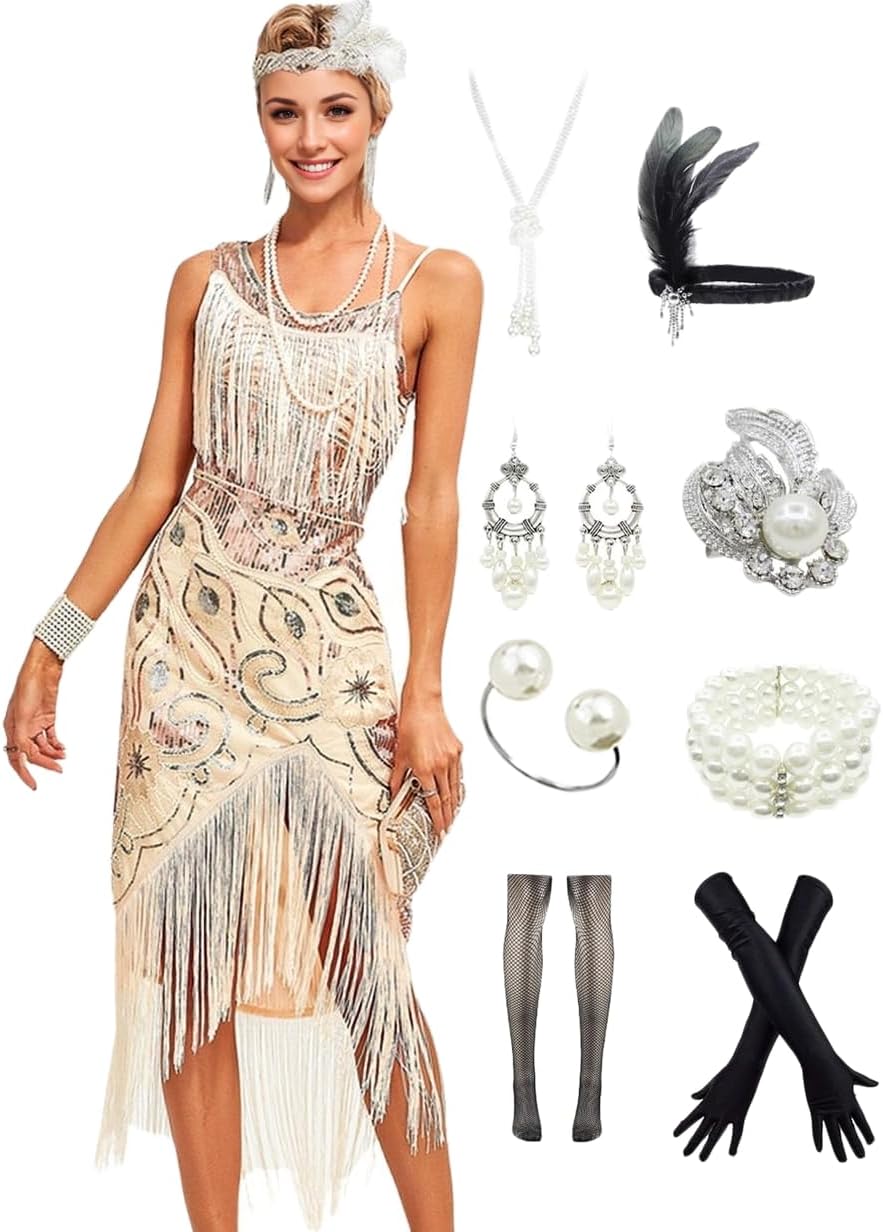 ๐Women 1920s clothing broke out of the prim and proper mold of Victorian ideals and into free spirited casual wear. In the roaring 20s, the clothing was glamorous and the women were elegant. Our 1920s collection includes fringe flapper dresses, flapper girl costumes,sequined flapper dress and beaded flapper dress. ๐Come with 1920s Accessories set, Its elegant chic design and 1920s great Gatsby style will make you look more charming, special and beautiful. ๐Package Include: ๐1 x 1920S Sequin Flapper Dress , ๐1 x Pearl Necklace; ๐1 x Satin Gloves; ๐1 x Crystal Bracelet; ๐1 x Headband ; ๐2 x Earrings; ๐2 x Fishnet stockings; ๐1920S Sequin Dress size chart: S-- Bust:29.9"--Waist:25.1"--Hip:31.4"--Lenght:27.9" M--Bust:31.4"--Waist:26.7"--Hip:33"--Length:28.7" L--Bust:33"--Waist:28.3"--Hip:34.6"--Length:29.5" XL--Bust:34.6"--Waist:29.9"--Hip:36.2"--Length:30.3"