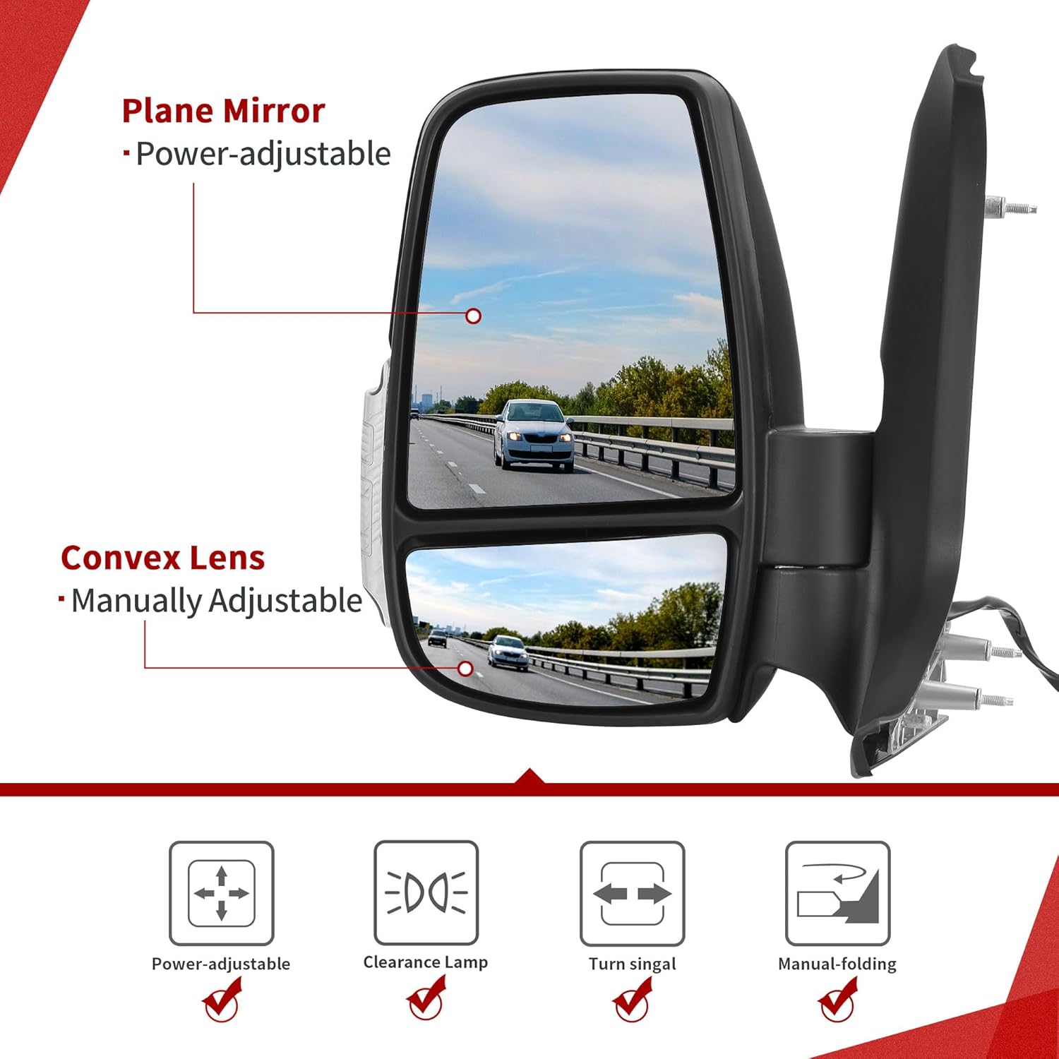 • Functions: featuring power adjustable and power heated plane mirror, the manually adjustable convex lens, LED signal lights, manual folding, helping you keep a watchful eye on your surroundings